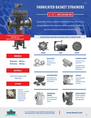 Titan Flow Control Basket Strainers 800-876-0036 Titan Simplex Basket Strainers are installed in a piping system to remove unwanted debris from the pipeline flow. 125 Cast Iron Flange Perforated Wye Strainer Part TYS58I0250P Item 2250101 Mfr.